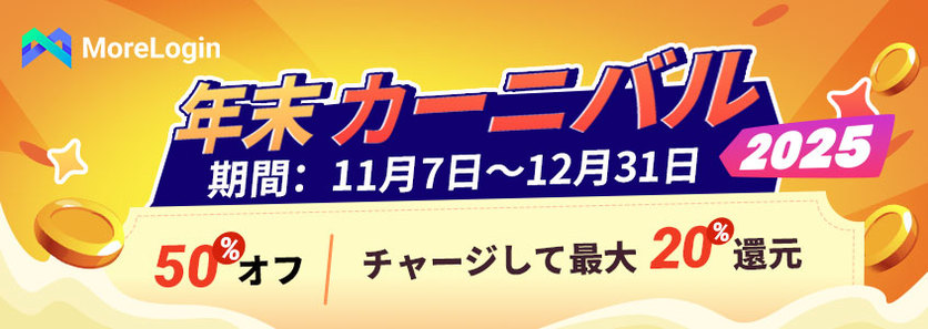 MoreLoginの2025年末カーニバルをチェック!プランが最大50%オフ、チャージで最大20%キャッシュバック!